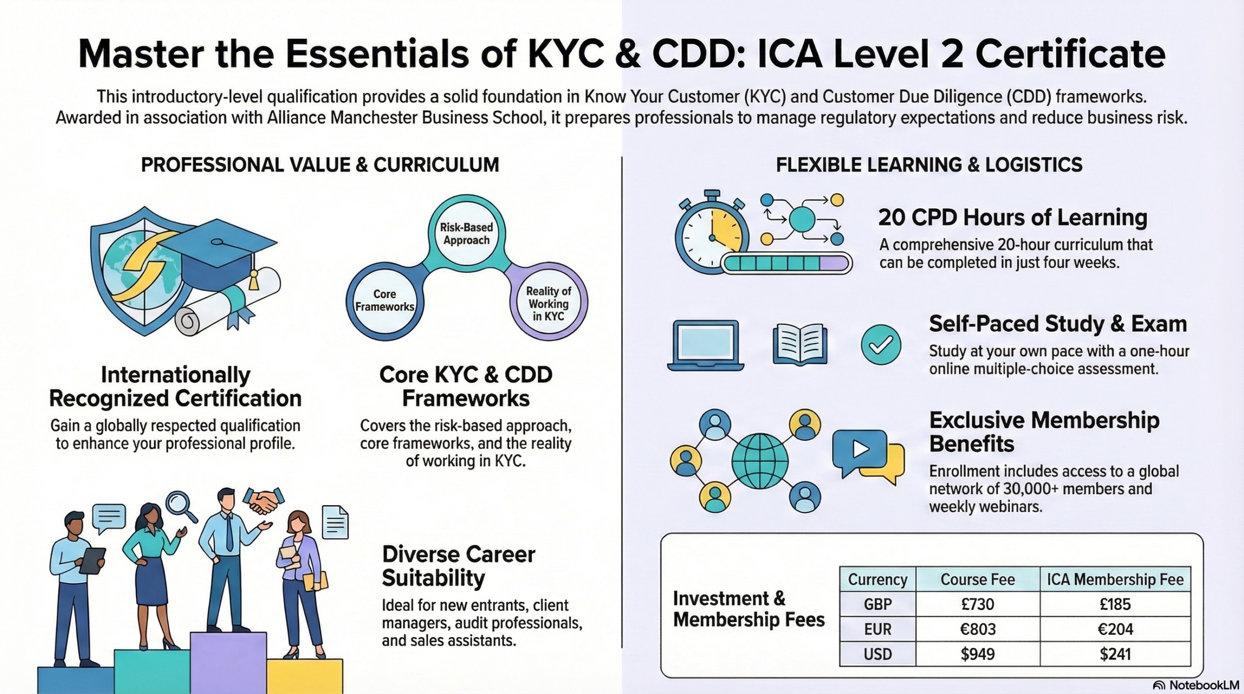 The ICA Certificate in KYC and CDD provides essential knowledge and practical skills to effectively perform customer due diligence, manage risk, and support compliance with global AML standards.