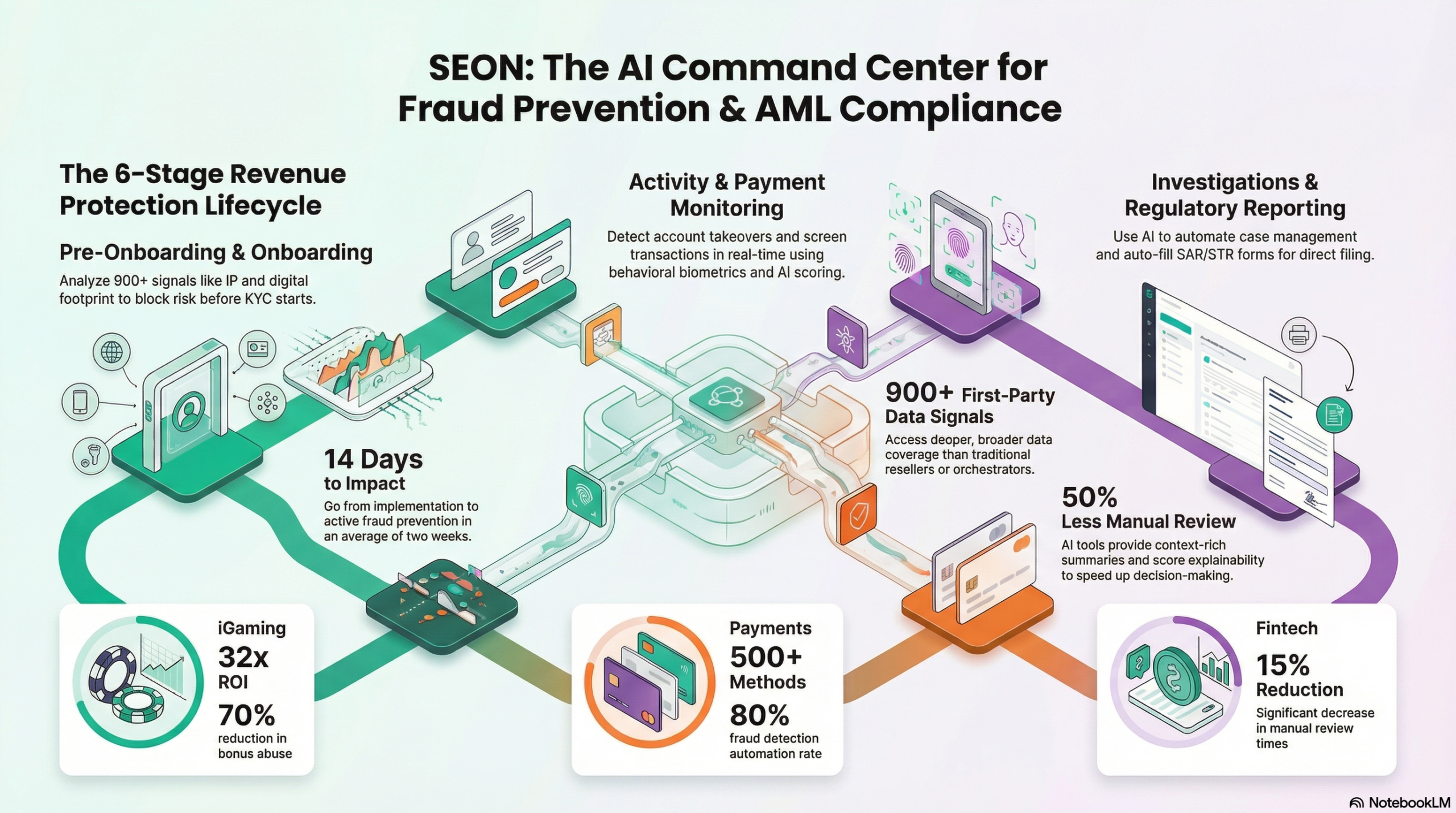SEON is a fraud prevention, identity verification and AML compliance platform designed to help organizations detect risk, verify users and investigate suspicious activity across the customer lifecycle. The platform combines digital footprint analysis, device intelligence, behavioral signals, AI-driven scoring and case management to support decisions from pre-onboarding and onboarding through login, account activity, payments, investigations and regulatory reporting. SEON positions itself as “the AI Command Center for Fraud Prevention & AML Compliance,” emphasizing a unified operating environment that connects more than 900 first-party data signals to enrich context and support action from a single platform.